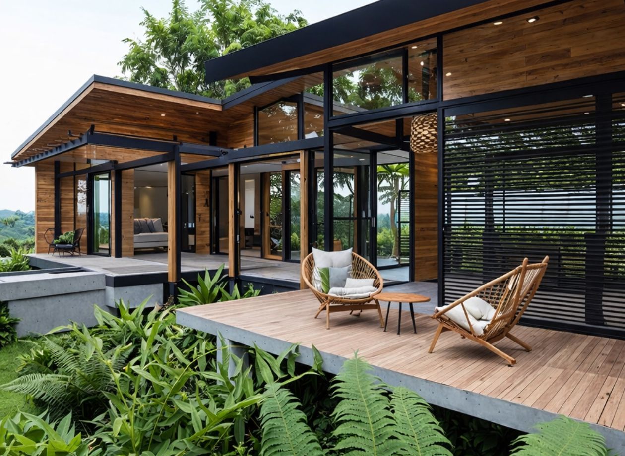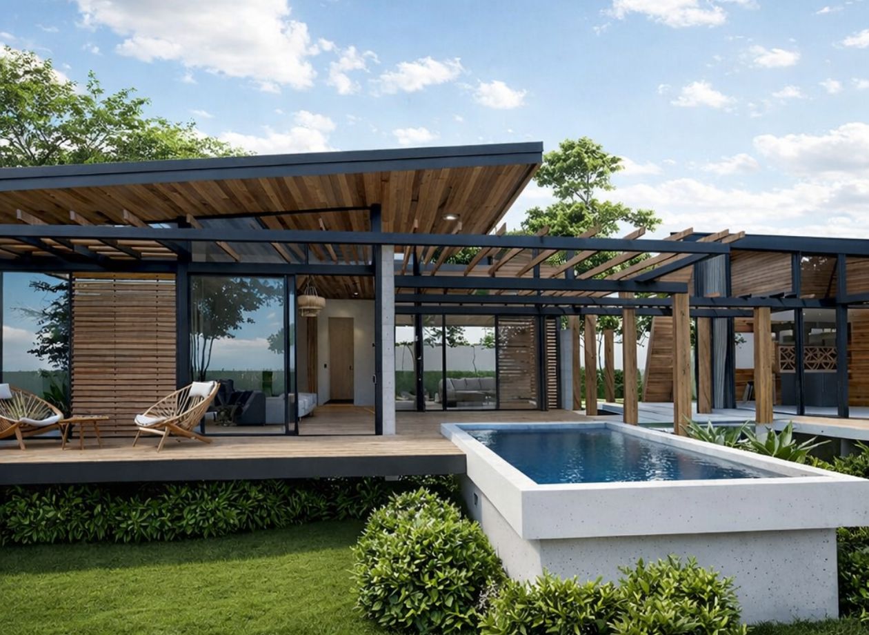 La casa cuenta con un diseño contemporáneo de concepto abierto, con una conexión fluida entre los espacios interiores y exteriores. Está construida con block de concreto y materiales de alta calidad, ideales para el clima tropical, combinando arquitectura moderna con acabados cálidos y naturales.